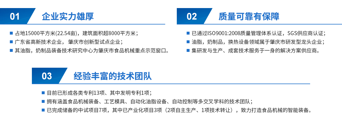 肇慶和邦機(jī)械制造有限公司專注于油脂,奶制品,換熱設(shè)備研發(fā)與制造,擁有涵蓋食品機(jī)械裝備、工藝模具、自動(dòng)化油脂設(shè)備、自動(dòng)控制等多交叉學(xué)科的技術(shù)團(tuán)隊(duì)。目前已形成各類專利13項(xiàng)、其中發(fā)明專利1項(xiàng)。目前,已完成儲(chǔ)備的中試項(xiàng)目7項(xiàng),其中已產(chǎn)業(yè)化項(xiàng)目3項(xiàng)(2項(xiàng)自主生產(chǎn)、1項(xiàng)技術(shù)轉(zhuǎn)讓),致力打造食品機(jī)械的智能裝備。